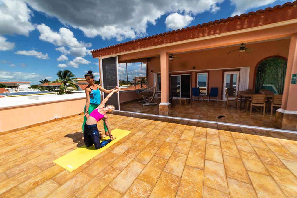 La amplia terraza de la villa que mira al Mar Caribe crea el espacio perfecto para nuestra práctica de yoga.